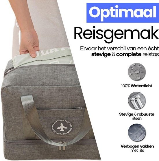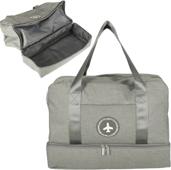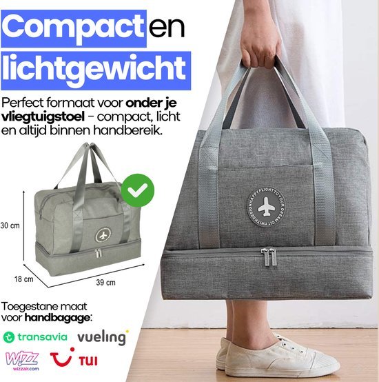 Reisen Sie stilvoll und bestens organisiert mit dieser grauen Handgepäcktasche, die speziell für die strengen Handgepäckbestimmungen von Transavia entwickelt wurde. Dank ihrer kompakten Maße von 40 x 30 x 20 cm passt sie problemlos unter den Flugzeugsitz und ermöglicht Ihnen jederzeit schnellen Zugriff auf Ihr Gepäck. Die aus hochwertigem Polyester gefertigte Tasche bietet fünf praktische Fächer mit viel Platz für Kleidung, Accessoires und andere wichtige Dinge. Eines der Fächer ist sogar wasserdicht ausgekleidet , sodass Ihre Sachen trocken und sicher bleiben. Die komfortablen Griffe und das geringe Gewicht machen das Reisen zum Vergnügen.