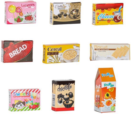 Setinhalt: Ladeneinrichtung, Kasse, Scanner, Einkaufswagen, Lebensmittel, Schachteln mit Gebäck und Süßigkeiten