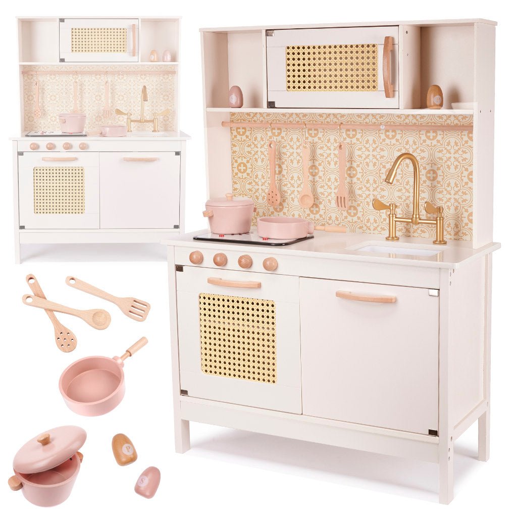 Lassen Sie kleine Köche in ihrer eigenen kulinarischen Traumwelt glänzen mit dieser luxuriösen Holzspielküche im rosa Boho-Retro-Stil . Mit ihrem stilvollen Look und den durchdachten Details ist diese Kinderküche nicht nur eine Augenweide, sondern auch eine Quelle für endlosen Spielspaß. Ausgestattet mit realistischen Elementen wie einem Wasserhahn mit Drehknöpfen, einem Backofen in Rattanoptik sowie Licht- und Soundeffekten auf den Kochfeldern fühlt sie sich wie eine echte Küche an. Dank des mitgelieferten Holzzubehörs können Kinder sofort als kleine Meisterköche loslegen.