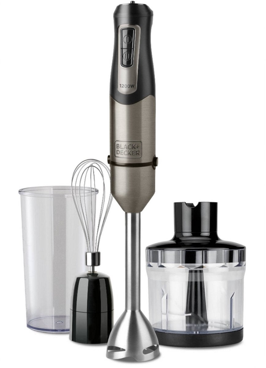 Discover the power and versatility of the Black & Decker BXHBA1200E Hand Blender – an indispensable aid in any modern kitchen. With its 1200W motor and 20 adjustable speeds, this hand blender delivers top performance, whether you want to create a smooth soup, a creamy sauce, or a light mousse. Thanks to the included measuring cup, chopper, and whisk, you have everything you need to get started quickly and efficiently.